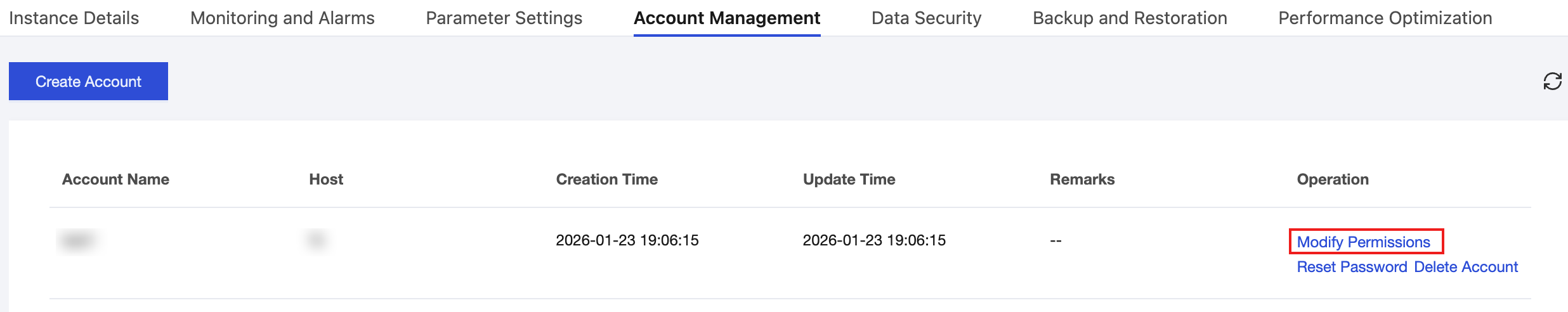 2.3 In the row of the target account, click Operation > Modify Permissions to grant the REPLICATION SLAVE and REPLICATION CLIENT privileges.