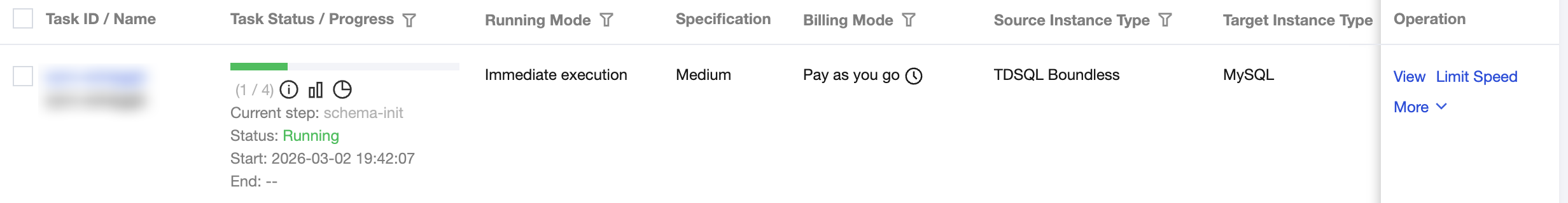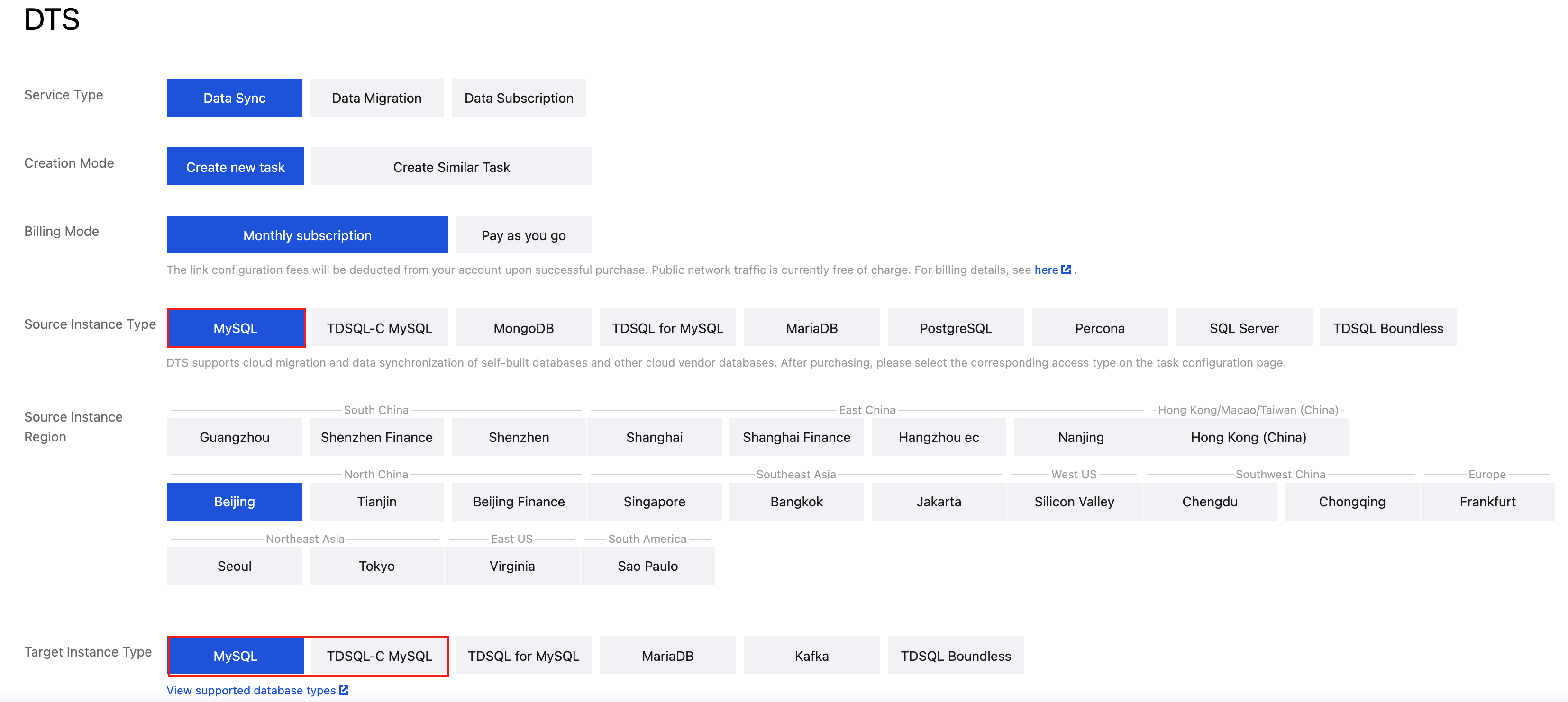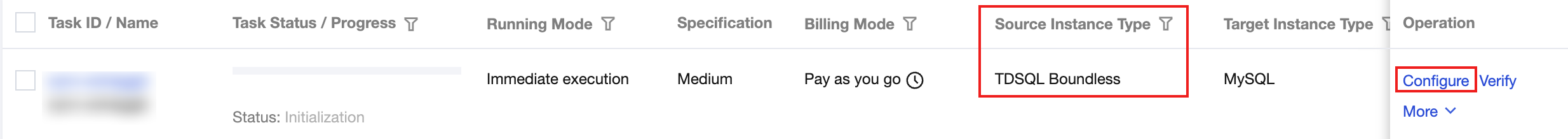 Source Database Settings | Source Instance Type | Select TDSQL Boundless. |