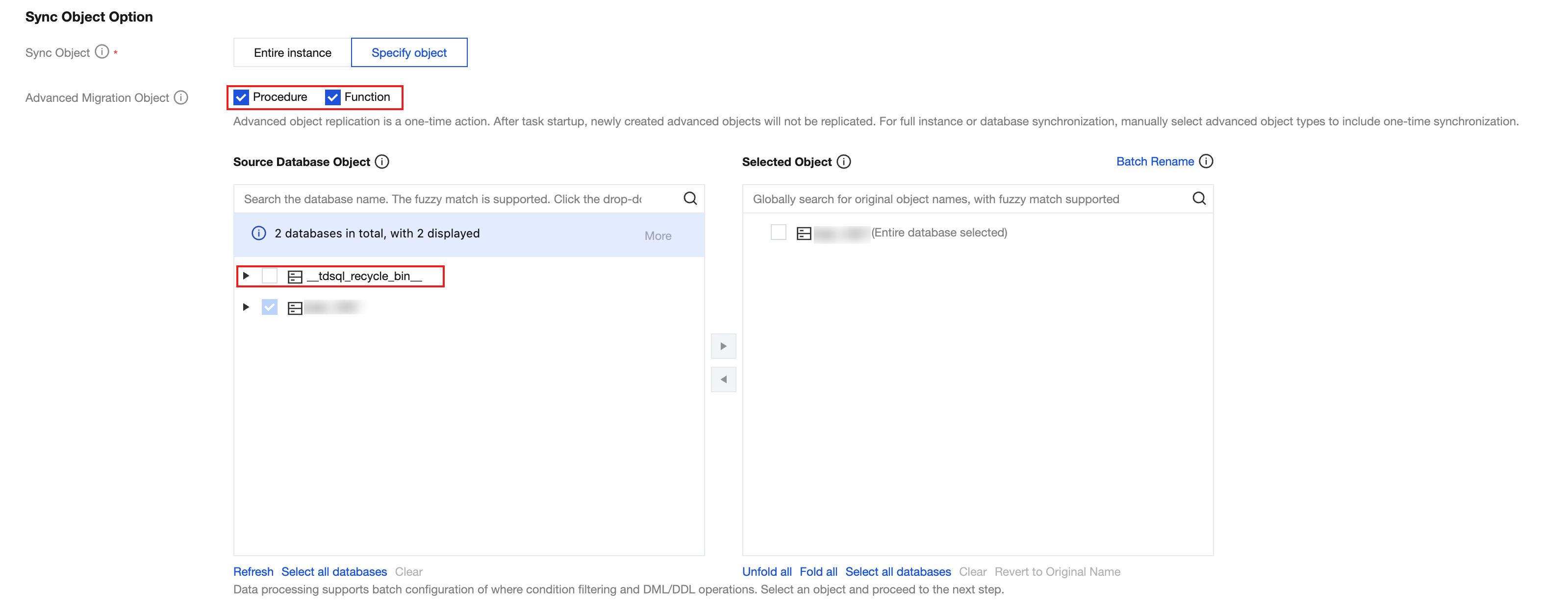The system currently does not generate Binlogs for FUNCTION, PROCEDURE, or TRIGGER operations. Therefore, do not select PROCEDURE and FUNCTION for advanced migration objects.