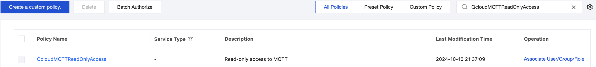 2. Select Policies in the left sidebar to enter the policy management list page, then input QcloudMQTTReadOnlyAccess in the search box on the right to search.