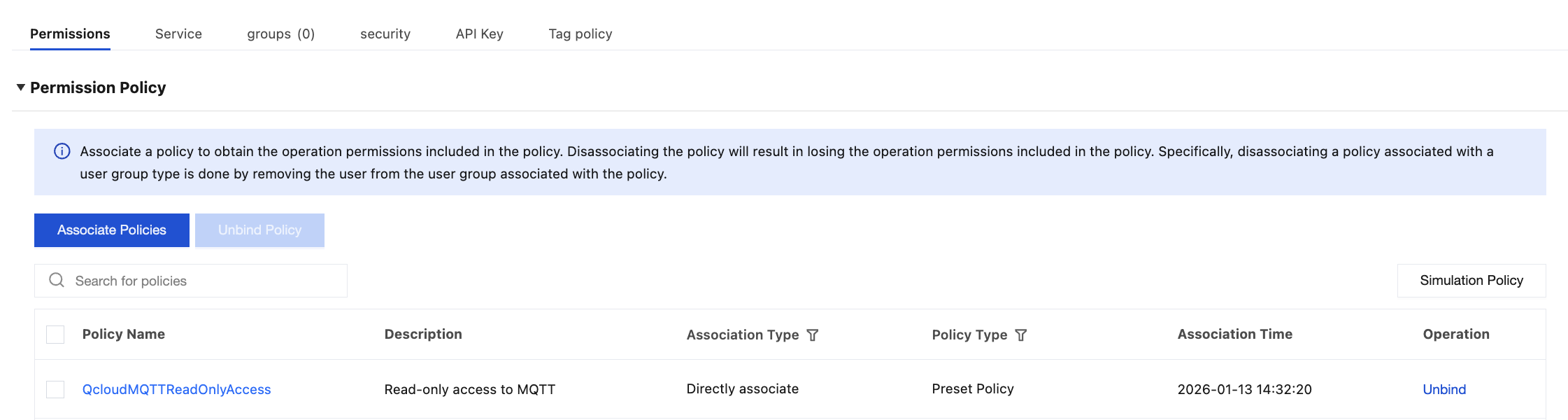 2. Select Policies in the left sidebar to enter the policy management list page, then input QcloudMQTTFullAccess in the search box on the right to search.