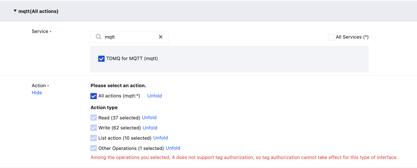 3. In the Visual Strategy Generator, enter mqtt in Service to filter, select TDMQ for MQTT (mqtt) from the results, choose All actions (*) under Actions, or select corresponding operations as needed.