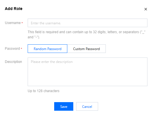 Password: Set user password, support system automatically generate password or customize settings. Password longest 64 characters, support digits, uppercase and lowercase letters, separators ("_", "-").