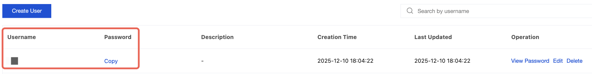 5. Click Save to complete user creation. Subsequently, in the user list, you can copy the username and password in any of the following ways.