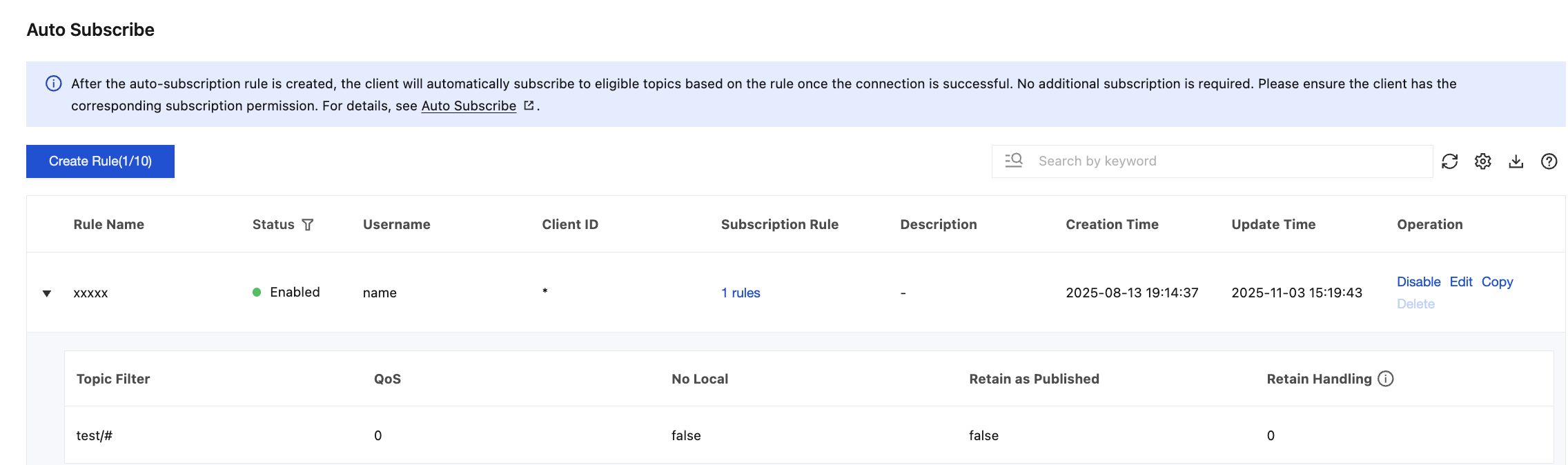 Auto subscription rules will follow the latest configured rule if a configuration conflict occurs (such as the same username subscribing to the same Topic Filter with inconsistent subscription options). Rules will be overwritten in chronological order.