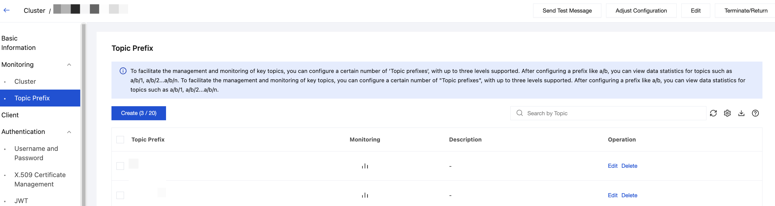 A single cluster supports creating a maximum of 300 Topic prefixes.
