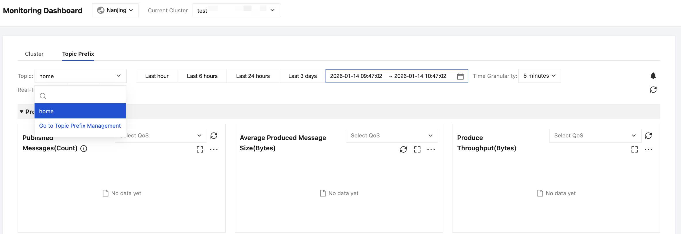 3. Select the Topic Prefix tab, choose the topic prefix you want to view in the dropdown list, set time range, and view the monitoring data.