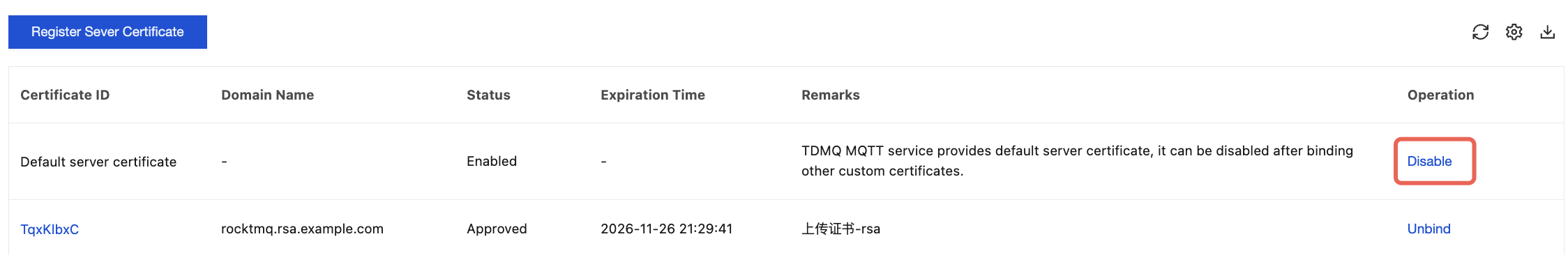 On the server certificate management page, click Disable in the operation column of the default server certificate. After confirmation in the pop-up window, the default certificate can be disabled.