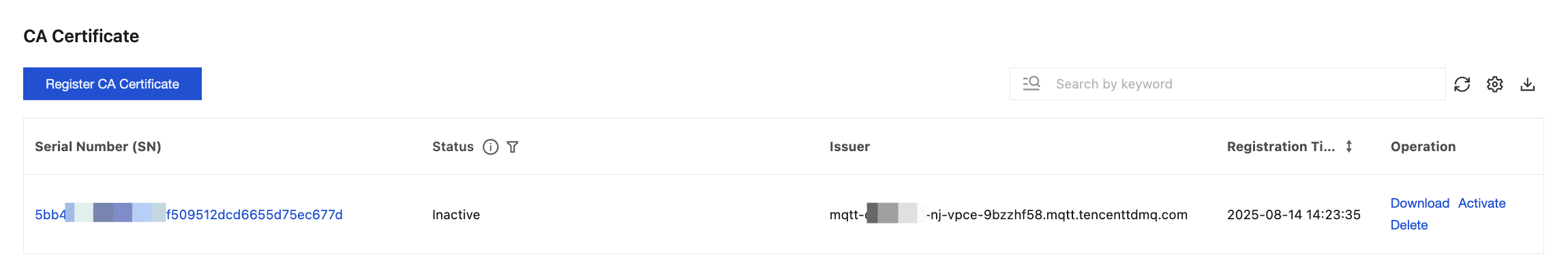 View Certificate Details | Click the serial number of the certificate. | On the certificate details page, the following information of the certificate is displayed: Basic Information: Displays the status, Common Name, Serial Number, and other details of the CA certificate. Associated Client Certificates: Displays client certificates associated with the current CA certificate. Click the serial number of a client certificate to view its details. In the operation bar, you can perform management operations such as download, activate, and revoke on the client certificate. |