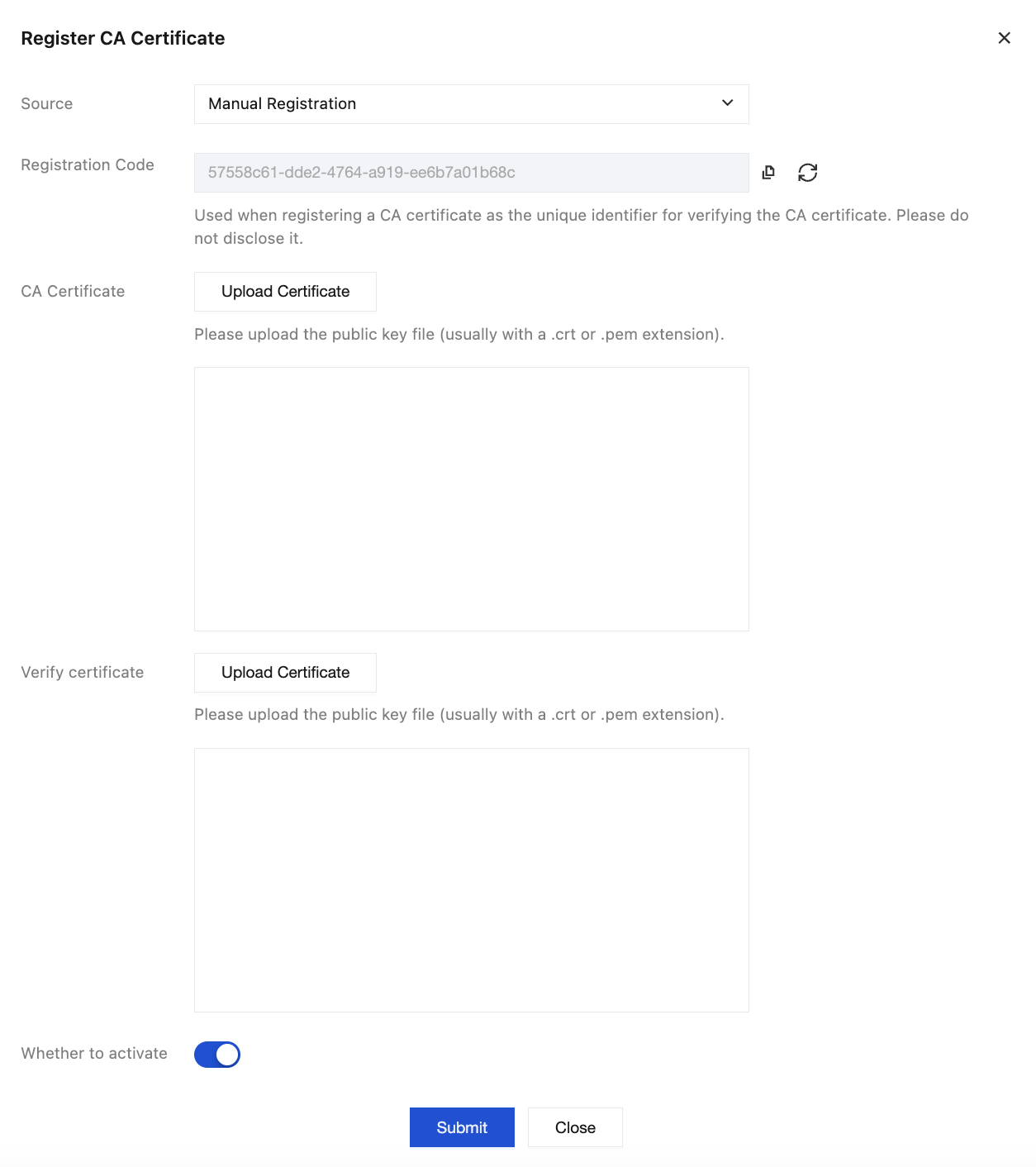 After completing the issuance of the CA certificate locally, you can obtain the registration code in the console to generate the corresponding verification certificate. The verification certificate is used to validate the authenticity of the CA certificate itself, including whether the certificate is issued by a trusted CA authority. The process for generating a verification certificate is as follows: