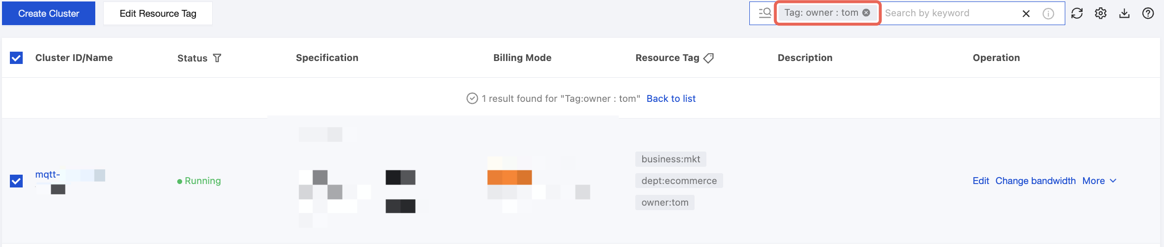 If the existing tags do not meet your requirements, go to the Tag Management page to create tags. 4. Click OK, and the system will display a message indicating that the modification is successful. You can view the bound tags in the Resource Tag column of the cluster.