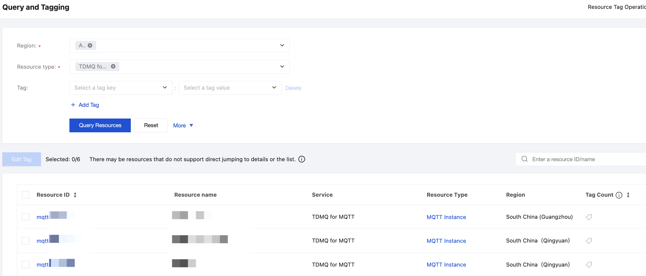 2. In the left sidebar, select Resource Tag, select query conditions as needed, and in Resource Type, choose TDMQ for MQTT > MQTT Instance.