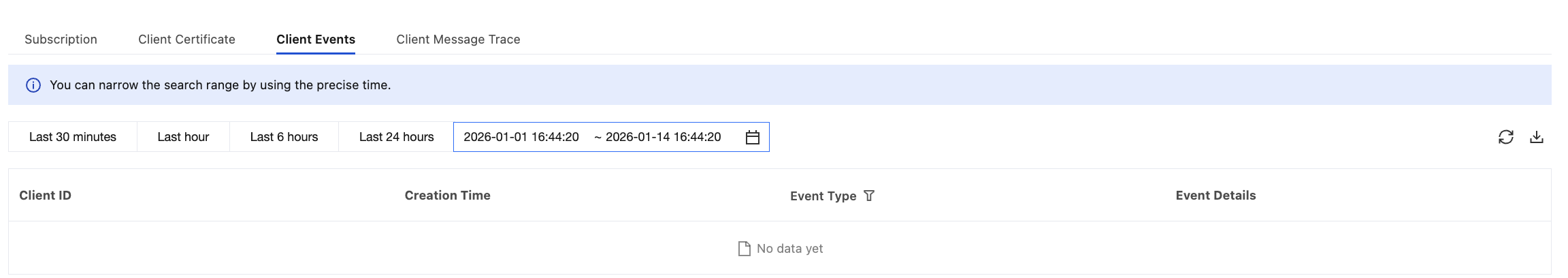 Client events are primarily used for diagnosing connectivity issues. If you encounter a situation where a device is online but unable to send or receive messages, it usually requires joint troubleshooting with Message Tracing.