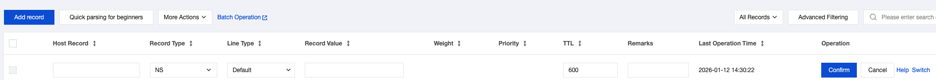 Record Value: enter the DNS server domain to be authorized. After the record is generated, a "." will be automatically added after the domain.