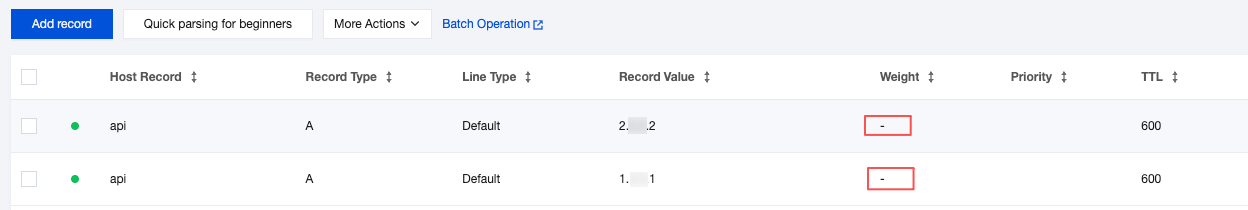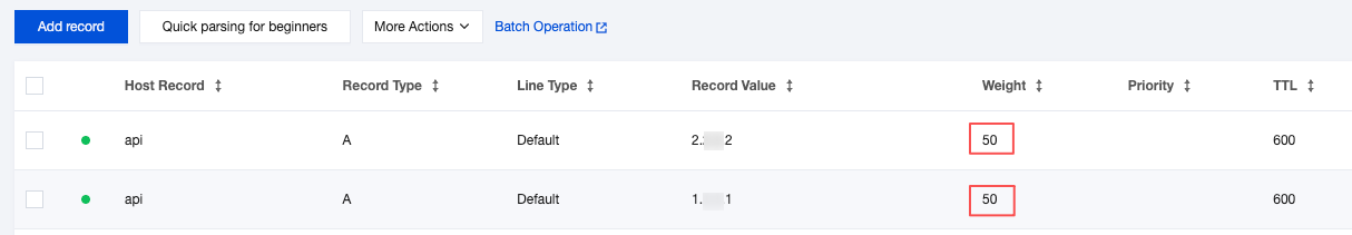 2. Enter the target weight proportion between 0 and 100. For example, to make two A records have equal load, enter 50 for each. Then, click Confirm as shown below: