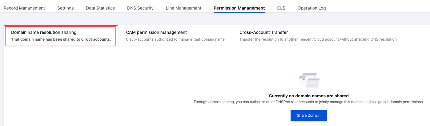 3. On the Permission Management tab, select Domain name resolution sharing > Share Domain. As shown in the figure below: