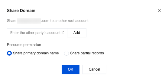 Account ID: enter the account ID of the other party (which can be viewed in Account Center). Share primary domain: this means granting full admin access to the domain name.