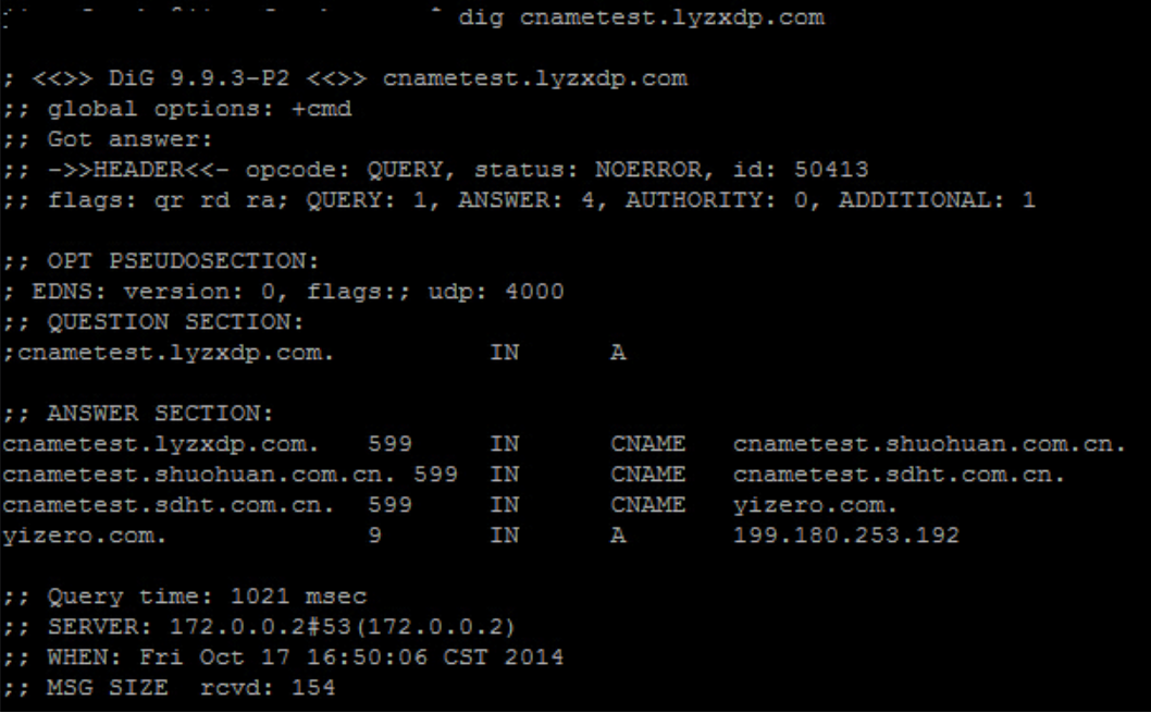 Before CNAME acceleration is enabled, the query time is 1021 msec:
