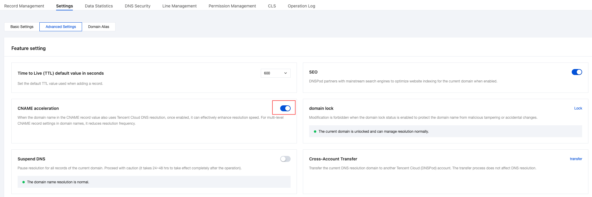3. Click the Settings tab, select Feature Settings > CNAME acceleration, and click Enable as shown below: