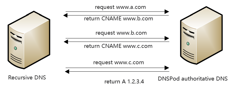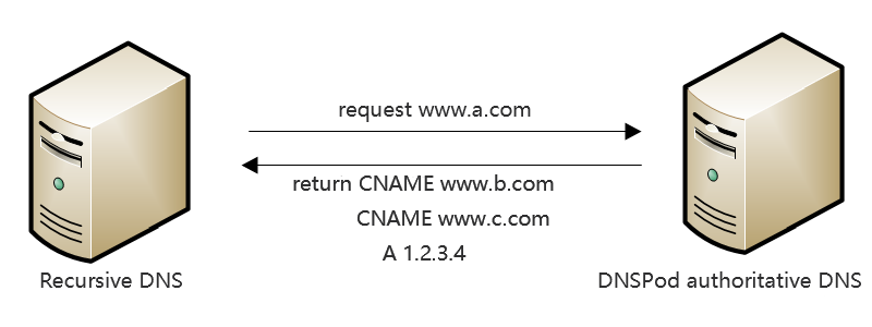 CNAME acceleration is a proprietary feature developed by DNSPod. It solves the issue where the resolving time is increased due to the fact that the recursive server needs to send multiple requests to the authoritative server when multiple CNAME records are configured.