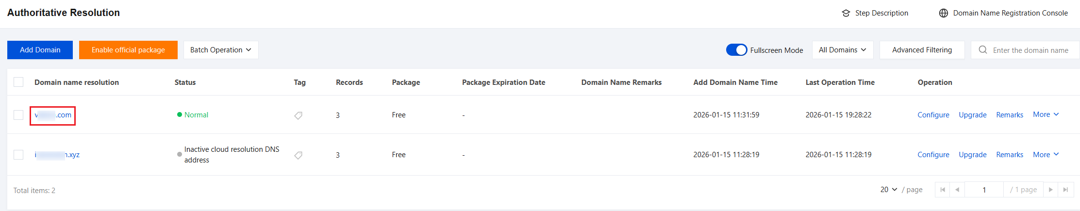 2. On the Authoritative Resolution page, click the domain name that needs to be transferred. As shown below: