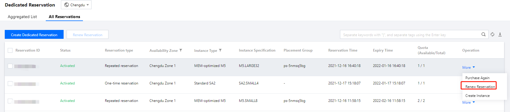 1. Select the target reservation, and click More > Renew Reservation under the Operation column, as shown below:
