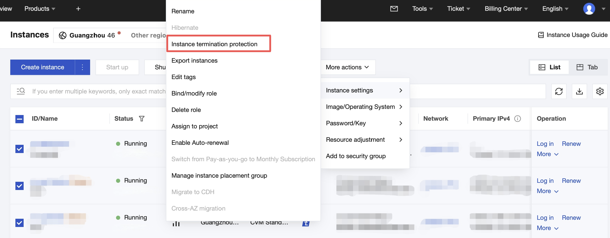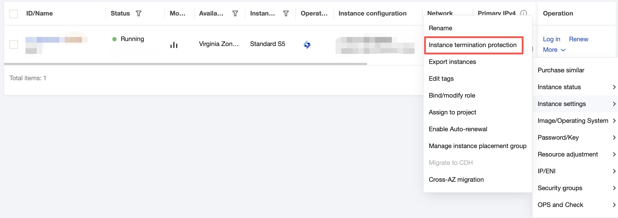 On the Instances page, find the target instance and click More > Instance settings > Instance termination protection.