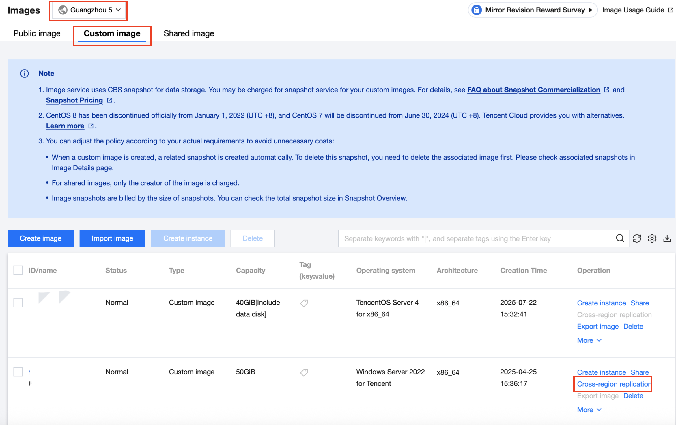 Cross-region replication of custom image | Deploy the same CVM instance across regions quickly. | Copy a custom image to another region, and use the created copy to create a CVM in the new region. |