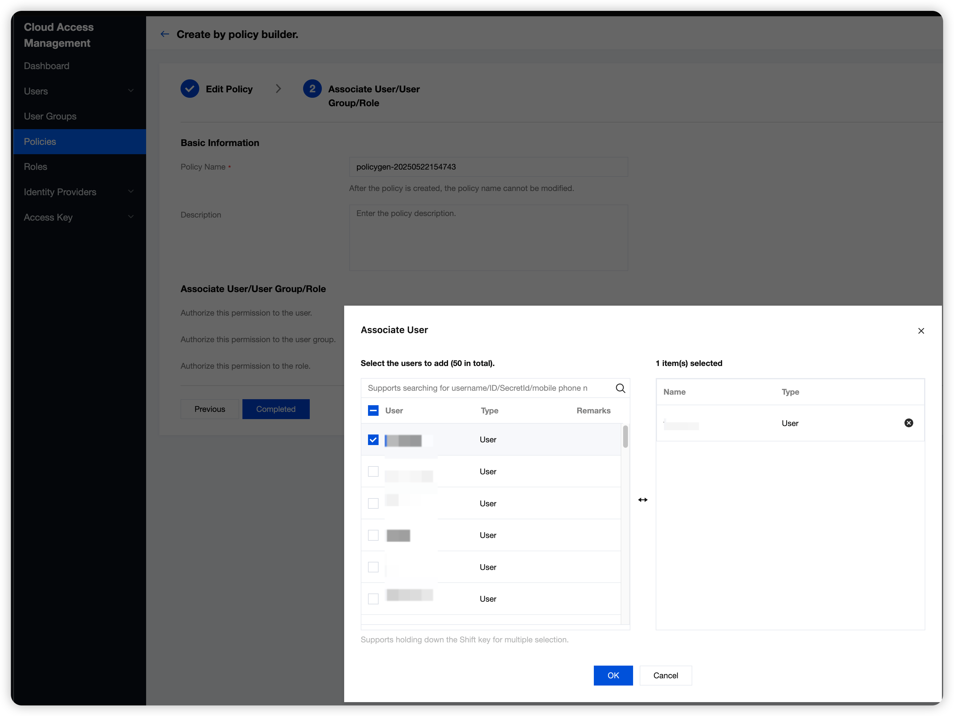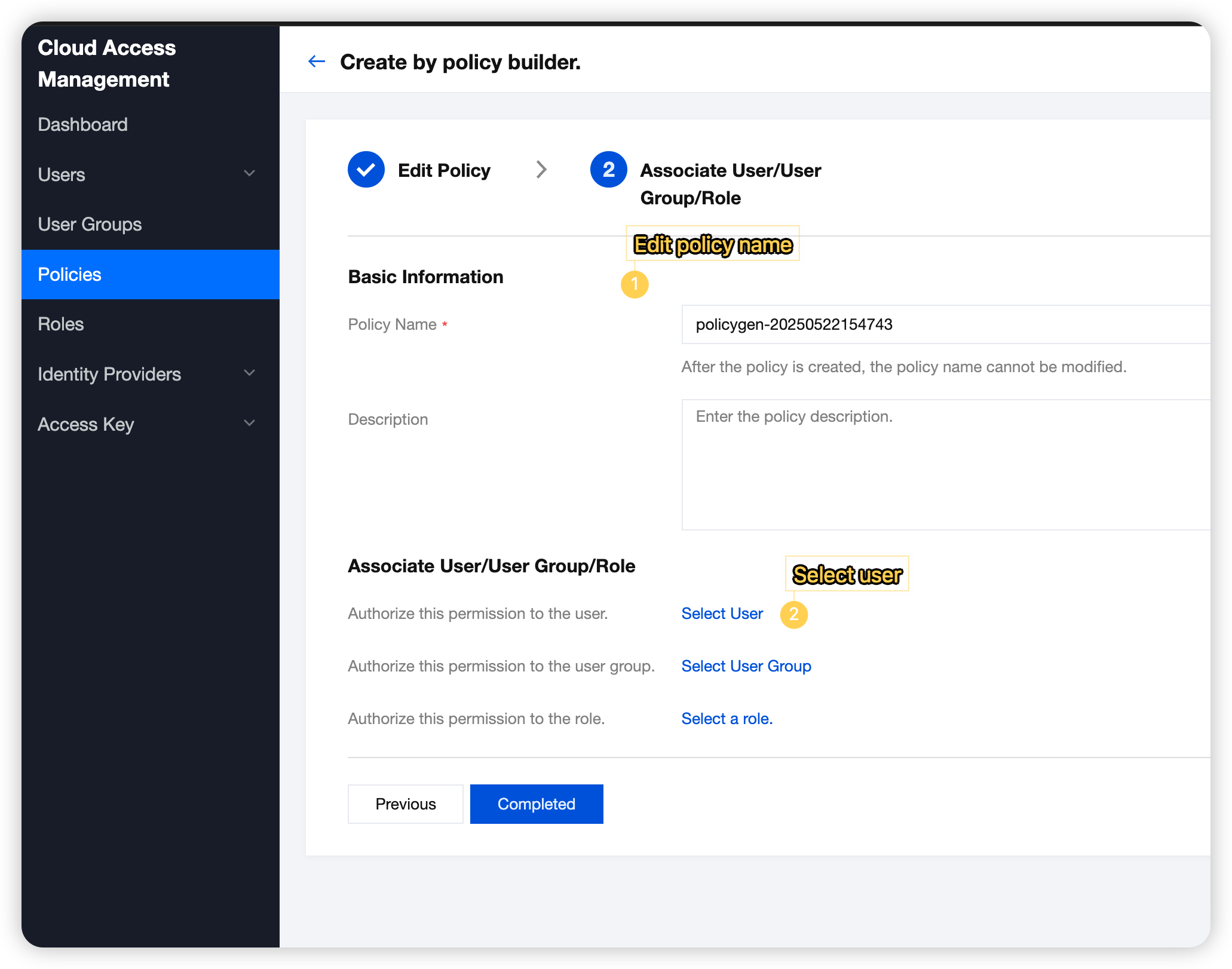 3. Click Next, enter the Associate User/User Group/Roles page, edit the policy name, and click Select User.