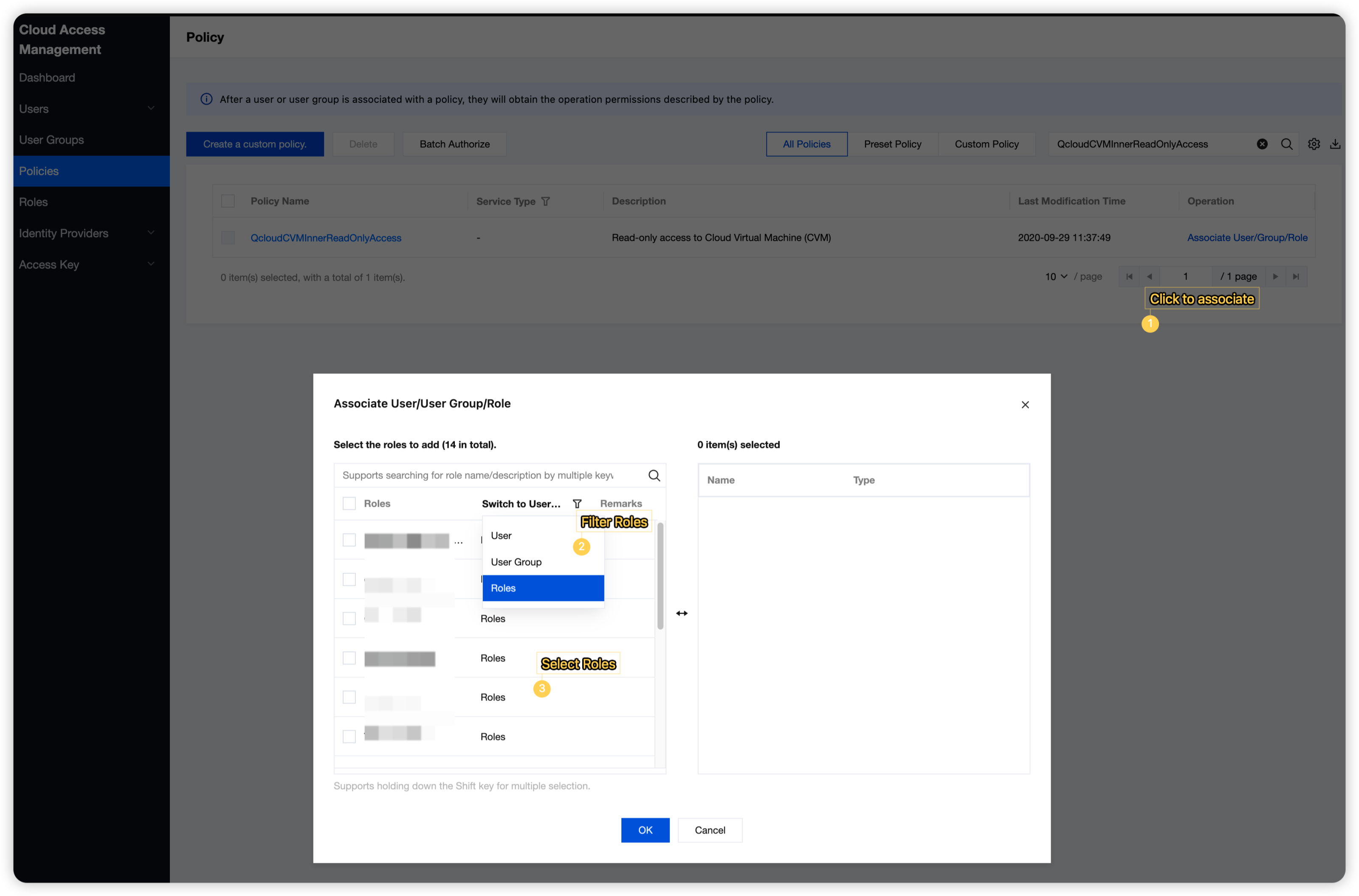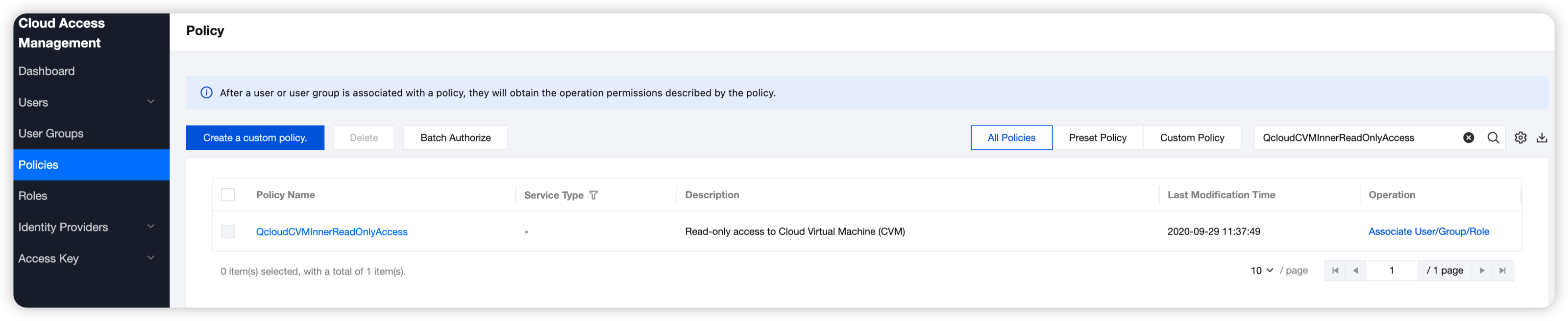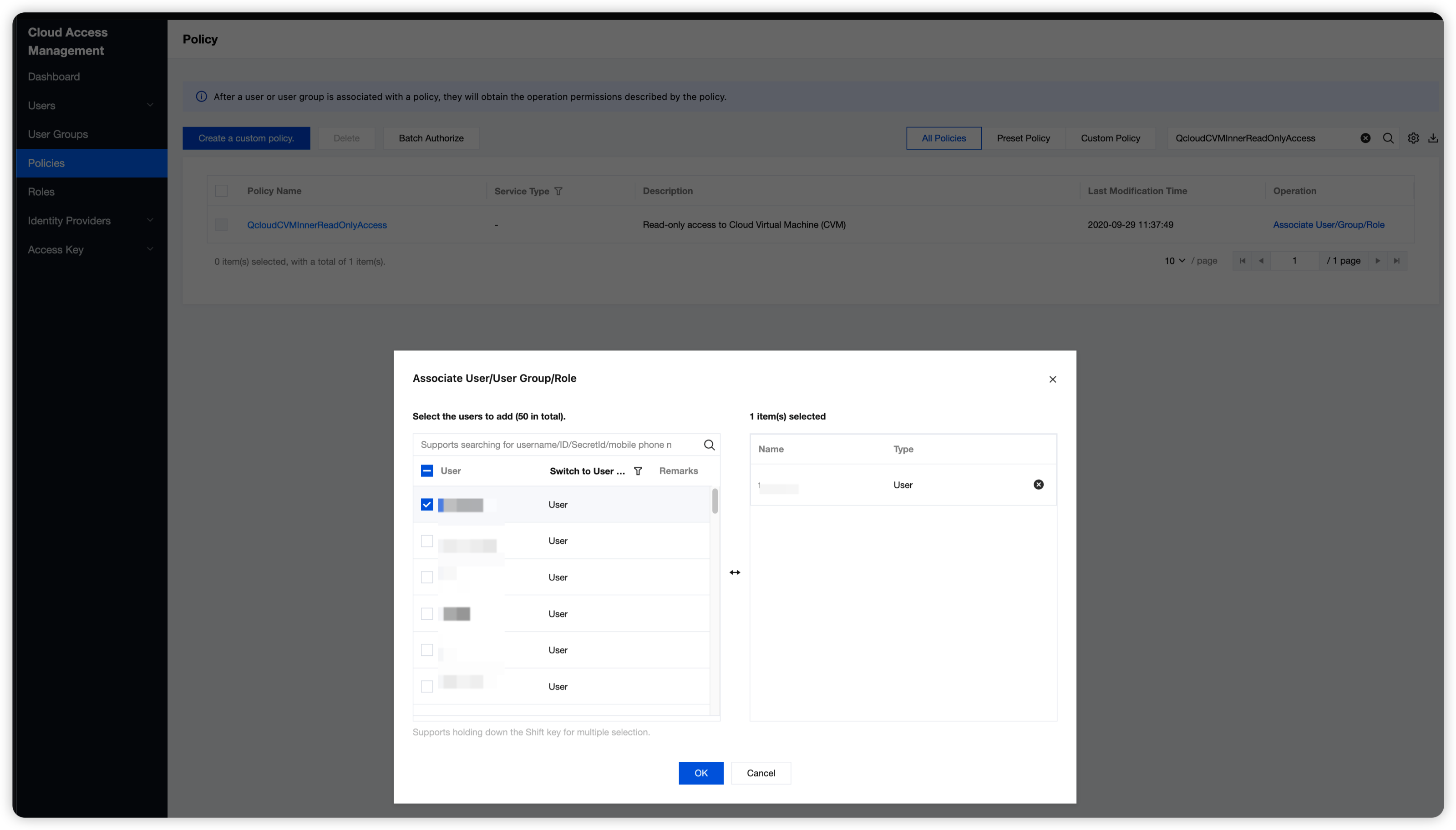 1. Go to the Policies page in the CAM console, enter QcloudCVMInnerReadOnlyAccess in the search box, and click Associate User/Group/Role in the Operation column. 2. Select users/user groups/roles to be associated in Associate User/User Group/Role pop-up dialog box. Then, click OK to complete the association between the policy and users.