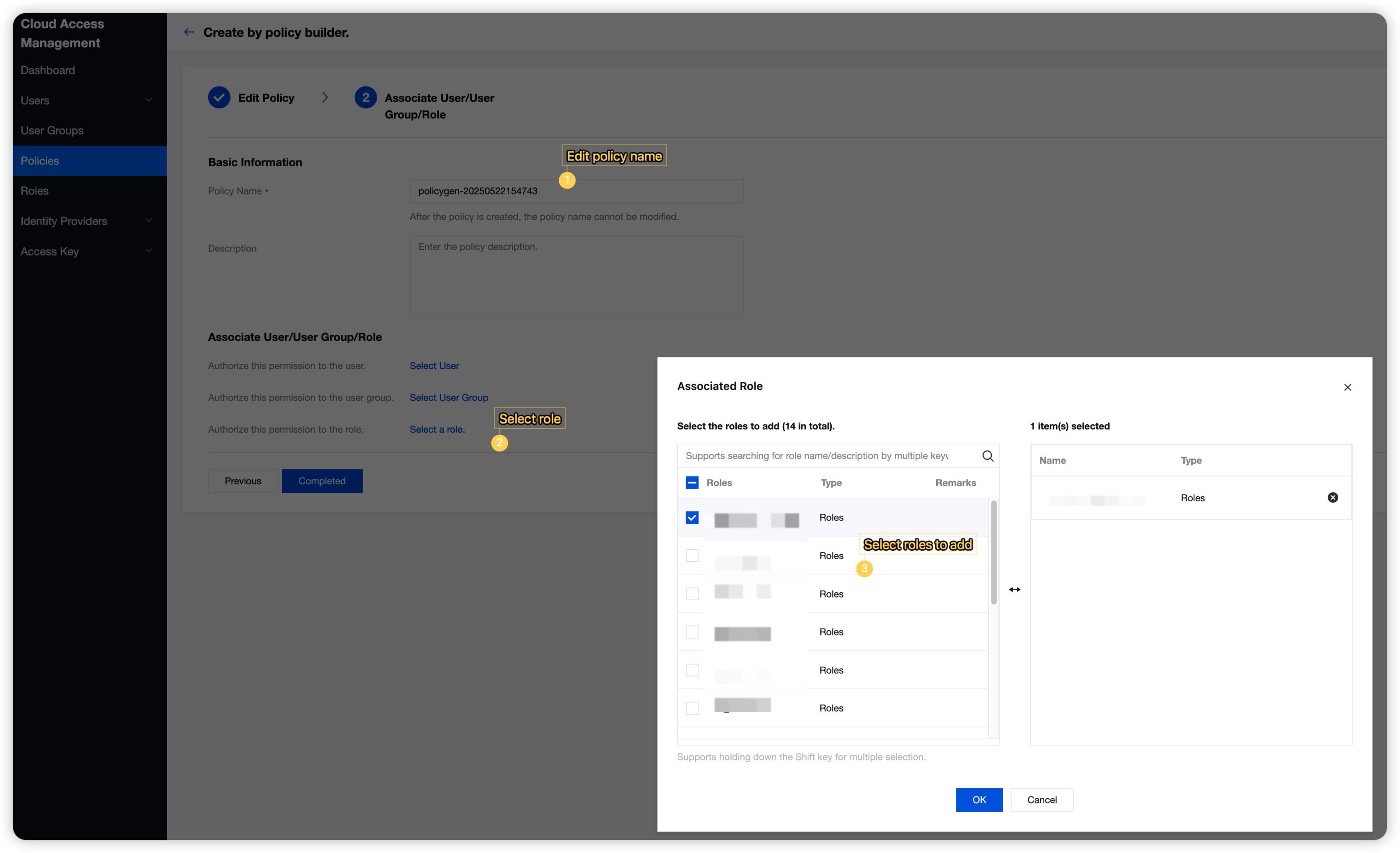3. Click Next, enter the Associate User/User Group/Role page, edit the policy name, and bind the policy to roles.