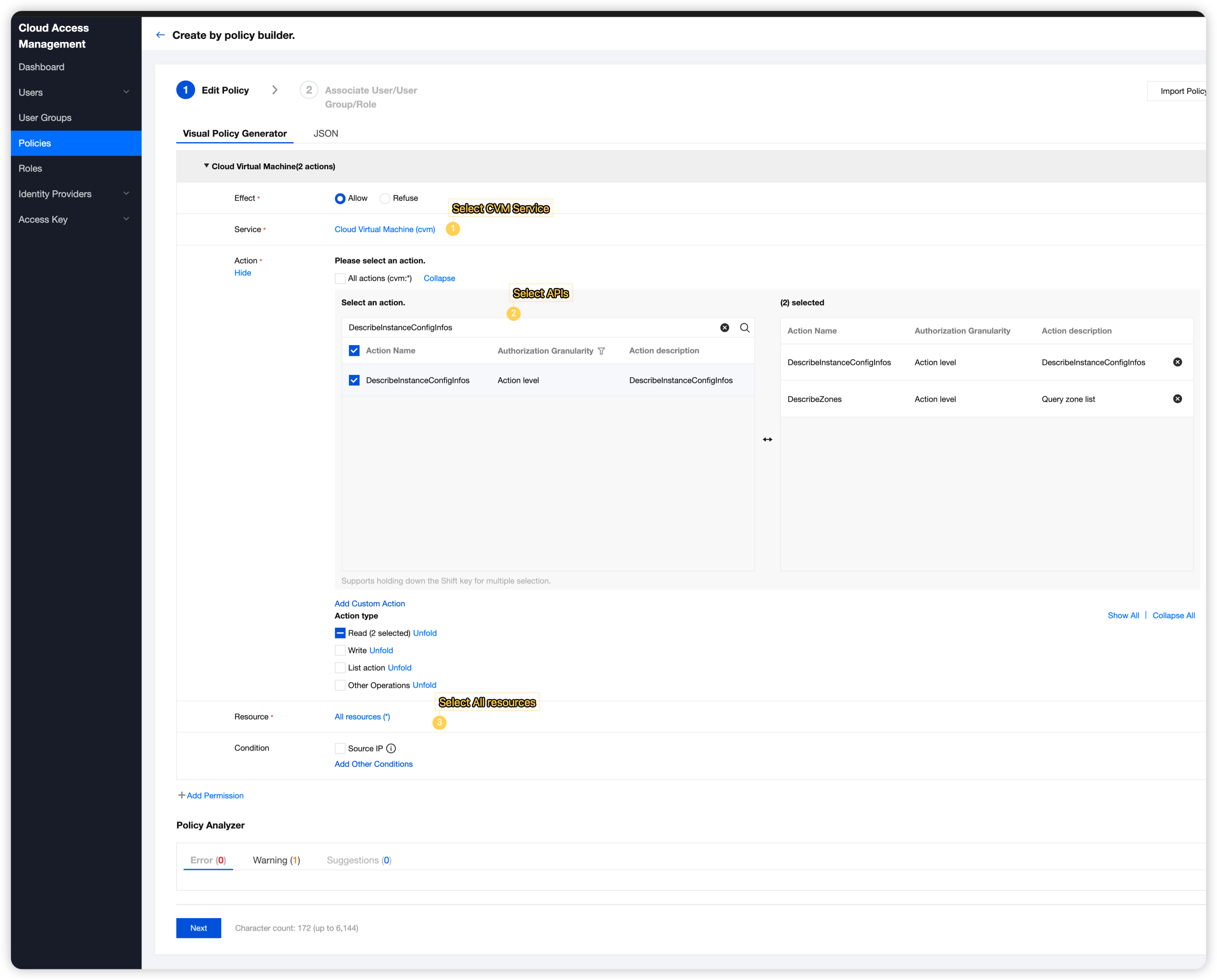 1. Go to the Policies page in the CAM console and click Create a custom policy in the upper left corner. 2. Choose Create by policy builder in the pop-up window of selecting the creation method, and configure relevant policy parameters.