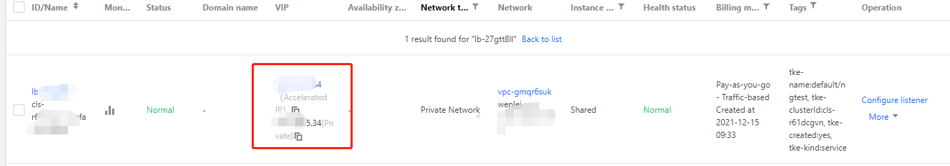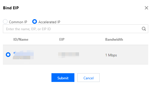 3. Log in to the CLB console, select a region in the top-left corner of the Instance management page, select the target private network CLB instance in the instance list, and choose More > Bind EIP in the Operation column. 4. In the pop-up window, select the accelerated IP address created just now and click Submit.