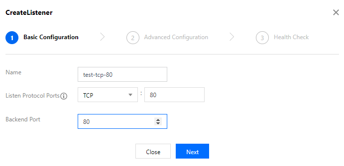 Listener Protocol Ports | Listener protocol and listening port Listener protocol: CLB supports protocols such as TCP, UDP, HTTP, and HTTPS. This example uses TCP. Listening port: used to receive and forward requests to real servers. The port range is 1-65535. The listening port must be unique in the same CLB instance. | TCP:80 |