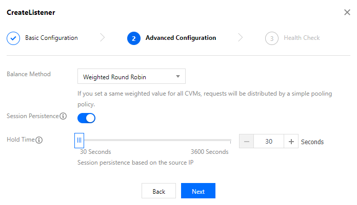 Hold Time | Session persistence time. If there is no new request in the connection within the session persistence time, session persistence will be automatically disconnected. Value range: 30-3600 seconds. | 30s |