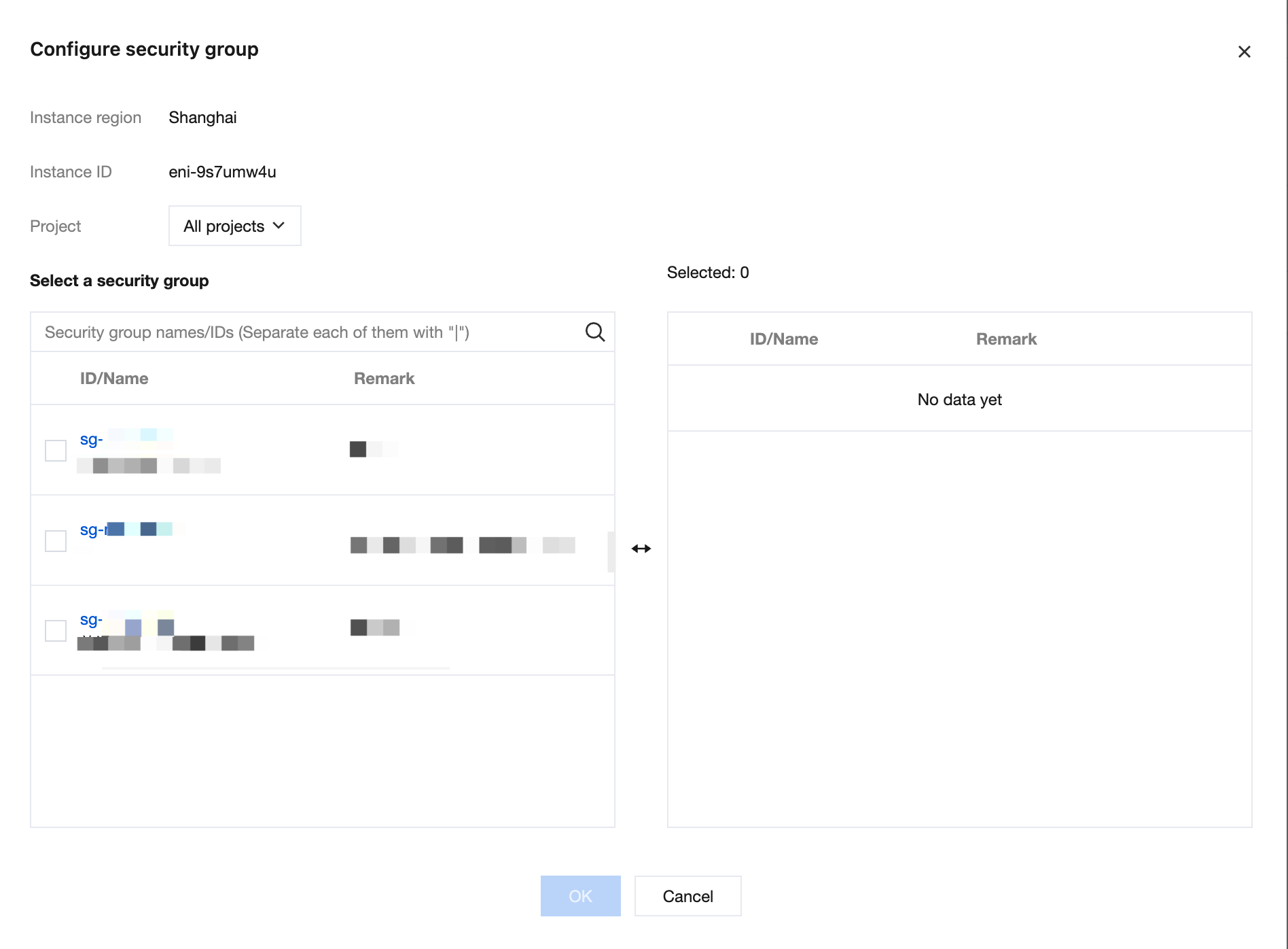 4. In the Configure Security Group dialog box, select the security group prepared in advance and click OK to complete the binding operation. If multiple security groups are bound, the one at the top of the list has the highest priority and is matched first.
