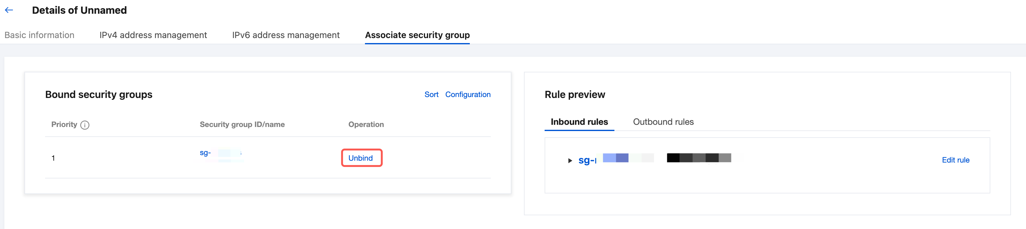 3. On the Associate Security Group tab of the details page, click Unbind in the Operation column of the security group to be unbound.