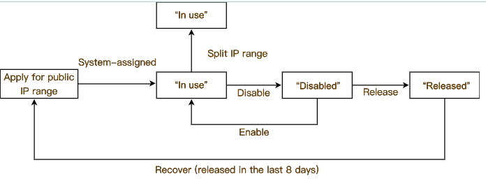Network Segment Splitting: Suitable for scenarios where network segments need to be refined. After the operation, the public IP status will remain "in use". 3. A public IP in the "disabled" state can undergo enabling and returning operations.