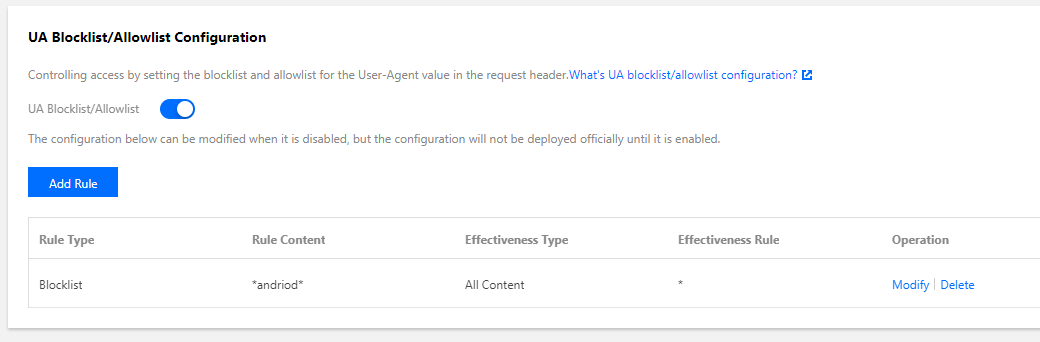 You can toggle the switch on to officially deploy the configured UA blocklist/allowlist.