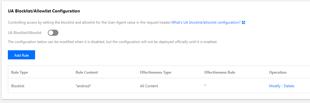 Log in to the CDN Console, select Domain Management on the left sidebar, and then click Manage on the right of a domain name to enter its configuration page. Select Access Control tab to find the UA blocklist/allowlist configuration, which is disabled by default: