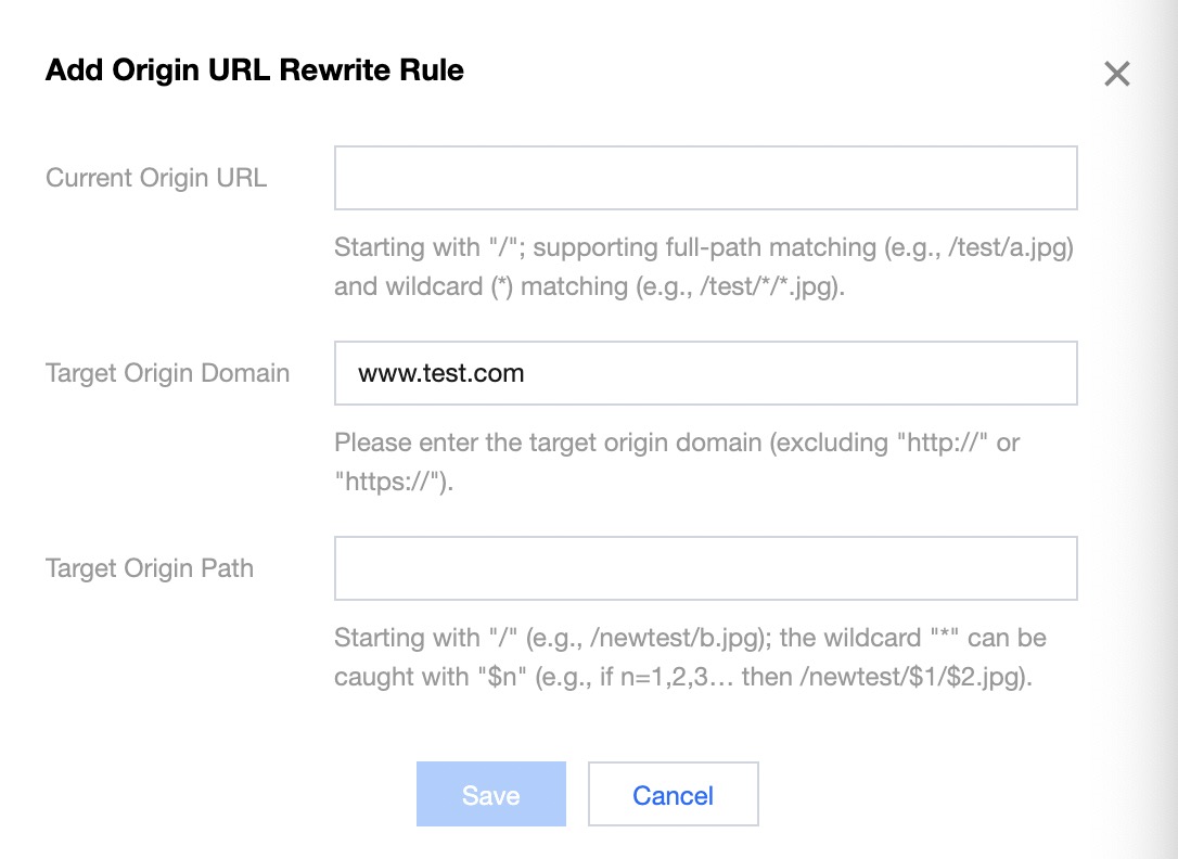 Current Origin URL: starting with “/”; prefix matching is used by default; supporting full-path matching (e.g., /test/a.jpg) and wildcard () matching (e.g., /test//*.jpg). If you want to specify a file directory, you cannot end the path with “/” (e.g., /test).