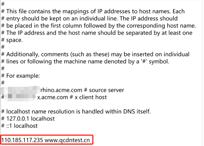 www.qcdntest.cn.cdn.dnsv1.com.cnping www.qcdntest.cn.cdn.dnsv1.com.cnwww.qcdntest.cn) obtained in Step 2 to your local hosts file in the format of “110.185.117.235 www.qcdntest.cn”.