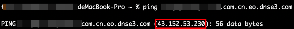 3. Get the node IP information assigned by EdgeOne for the domain name by entering ping www.example.com.eo.dnse3.com in the command line tool and viewing the corresponding node IP returned.