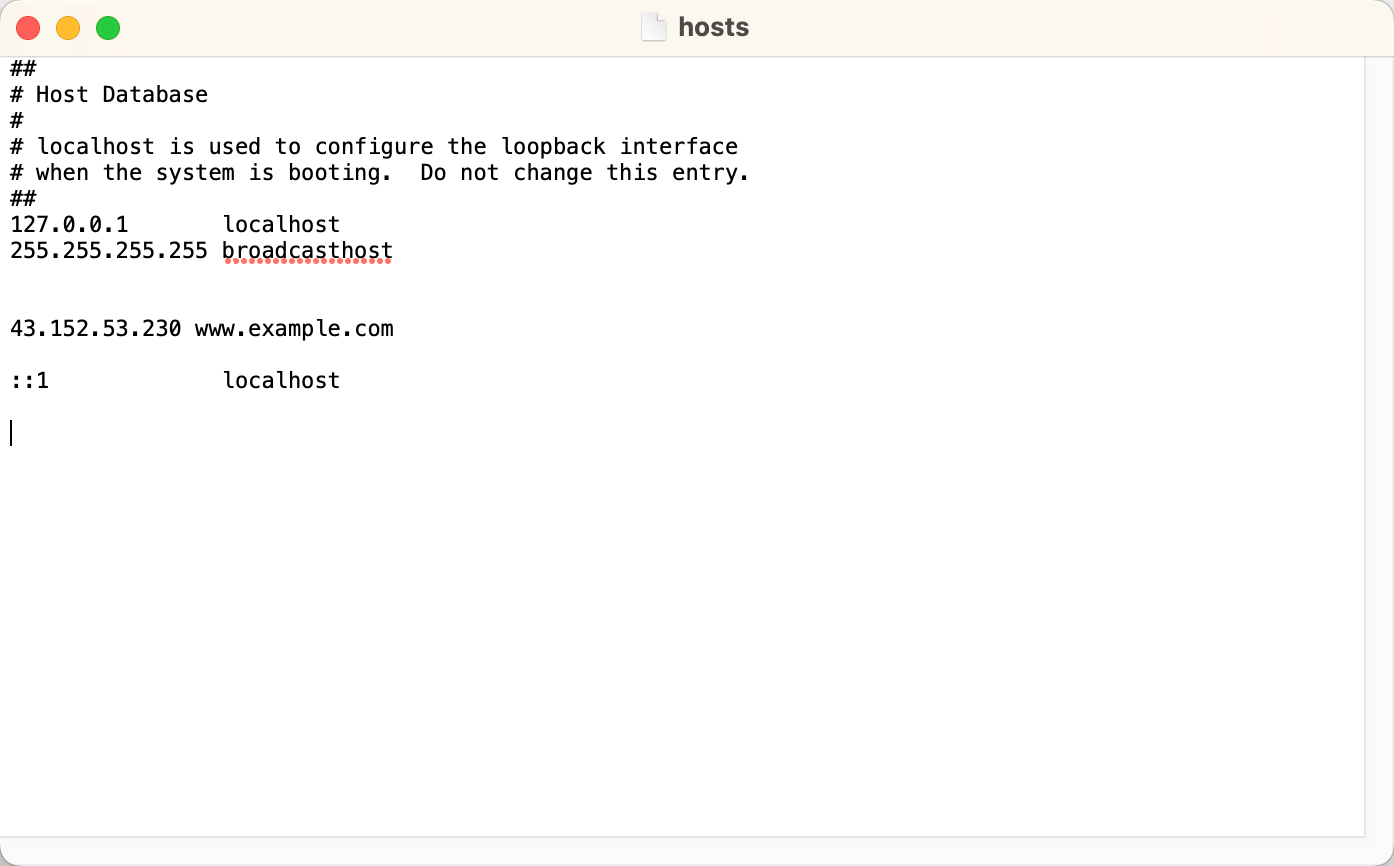 4. Bind the node IP (43.152.53.230) obtained in step 3 and the acceleration domain name (www.example.com) to the local hosts file on the computer, as shown below: