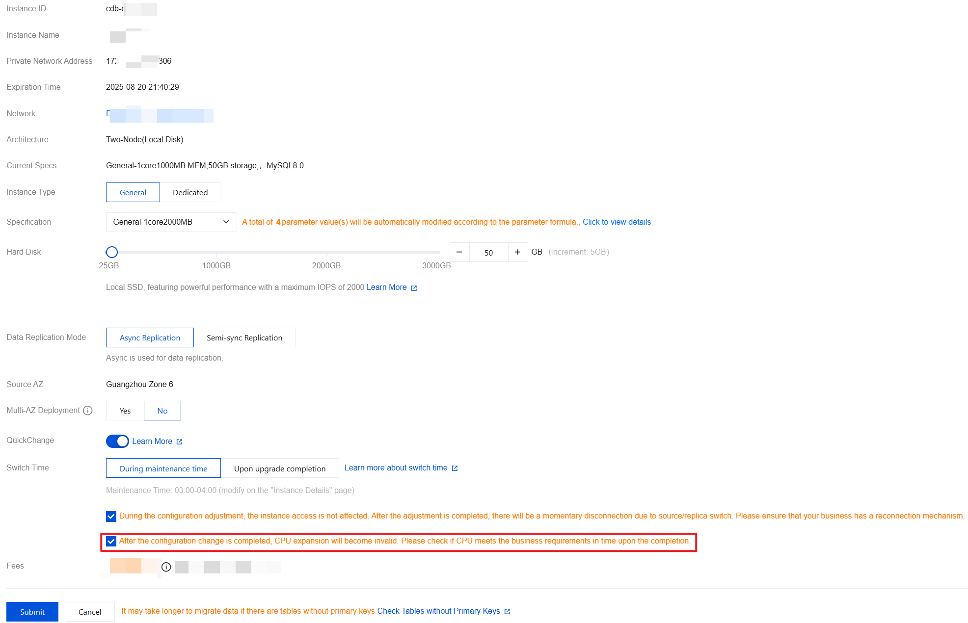 | Disk Expansion and Contraction | When only modifying the disk capacity, there is no need for master-slave switching or restarts. The configuration change page will indicate: "Current changes will not involve data migration or instance restart." |