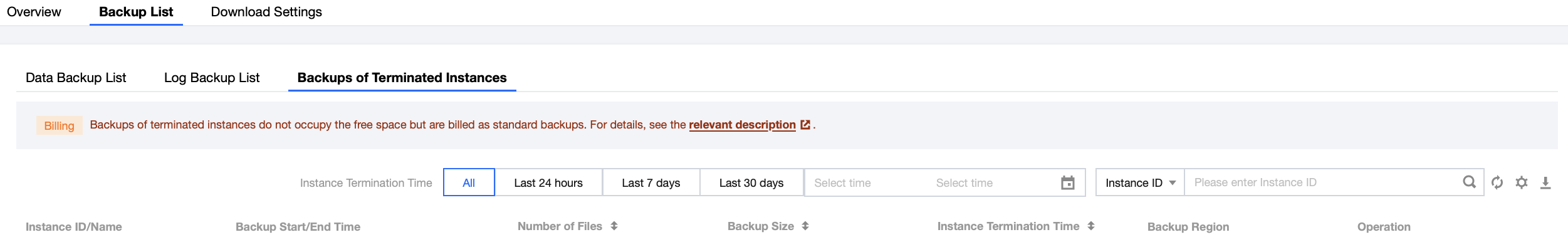 Do not retain | If you select Do not retain, backups will be terminated simultaneously after instance termination and will not be saved. |