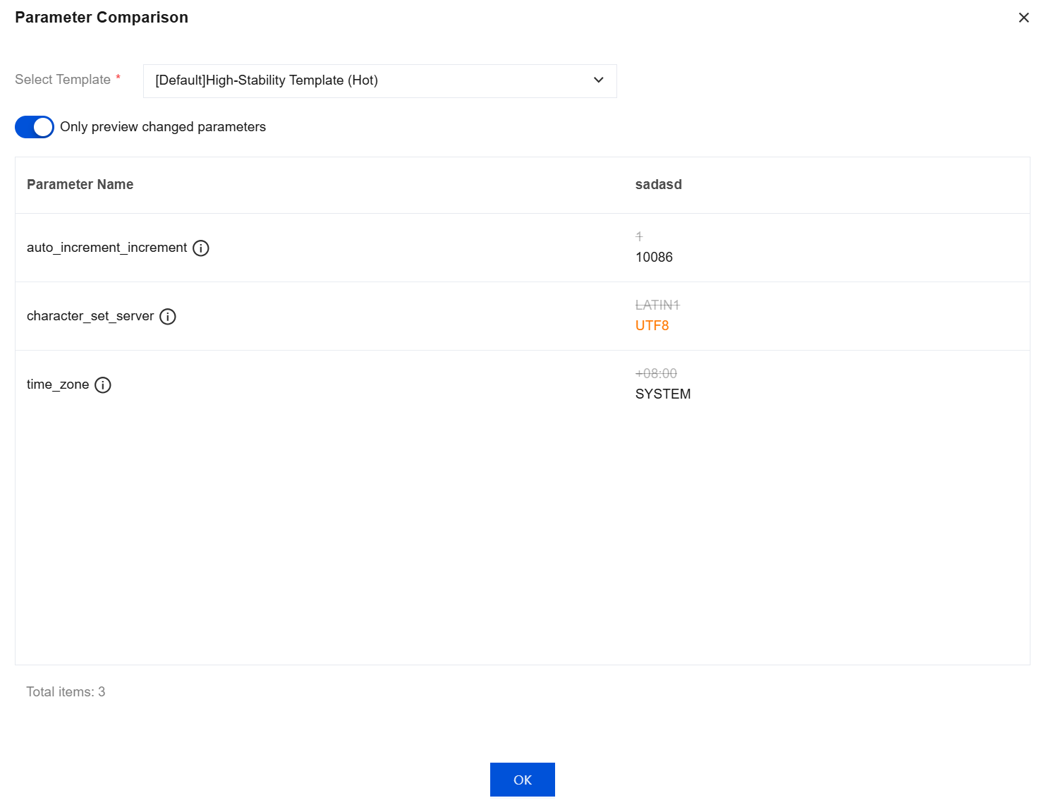 You can compare custom parameter templates with other custom templates or default templates to view their differences in the TencentDB for MySQL console.