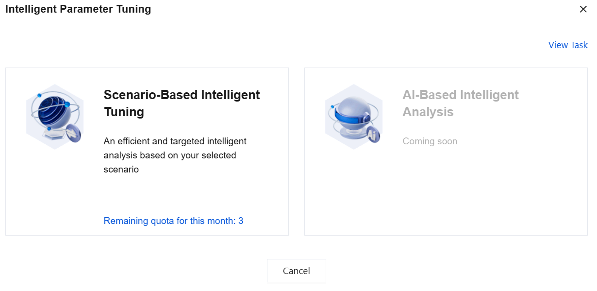 3. In the Intelligent Parameter Tuning pop-up window, select Scenario-Based Intelligent Tuning or AI-Based Intelligent Analysis as the tuning method and click Analyze.