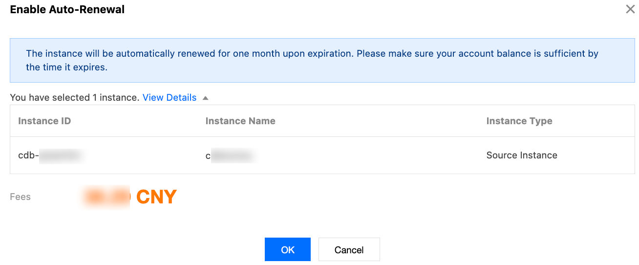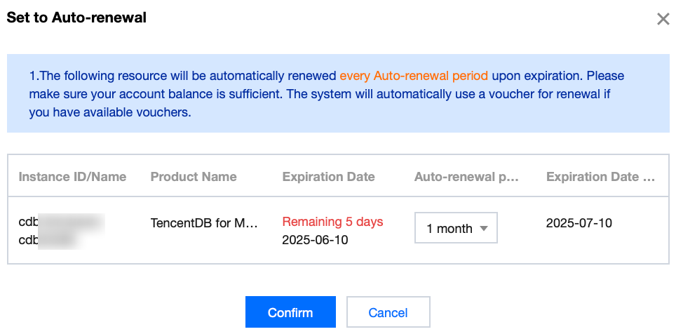 As shown in the following figure, "The instance will be automatically renewed for 1 month after expiration" in the dialog box means that automatic renewal has been set, and the instance will be automatically renewed for 1 month every time it expires.