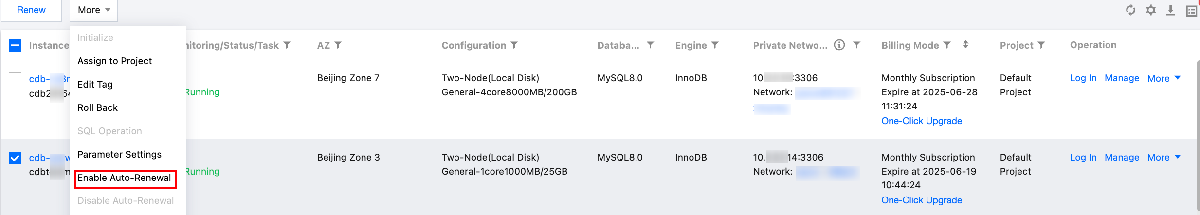 1. Log in to the MySQL console, select one or more instances in the instance list, and select More > Enable Auto-Renewal above. 2. In the pop-up dialog box, confirm that everything is correct and click OK.